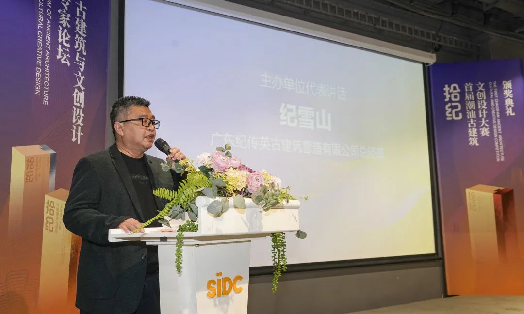 广东纪传英古建筑营造有限公司总经理纪雪山发表讲话,向本次文创大赛的获奖者致以衷心的祝贺,对前来指导、参与活动的各位嘉宾朋友们表示诚挚的感谢及欢迎。他表示,纪传英古建筑公司作为国家级非遗项目“潮汕古建筑营造技艺”保护单位,将保护、传承、弘扬潮汕传统文化为已任,不负新时代赋予的文化使命,将优秀传统建筑文化遗产发扬光大,并通过本次文创大赛,促进非遗项目的活态利用,推动传统建筑文化融入现代生活,实现传统文化面向未来的可持续发展。