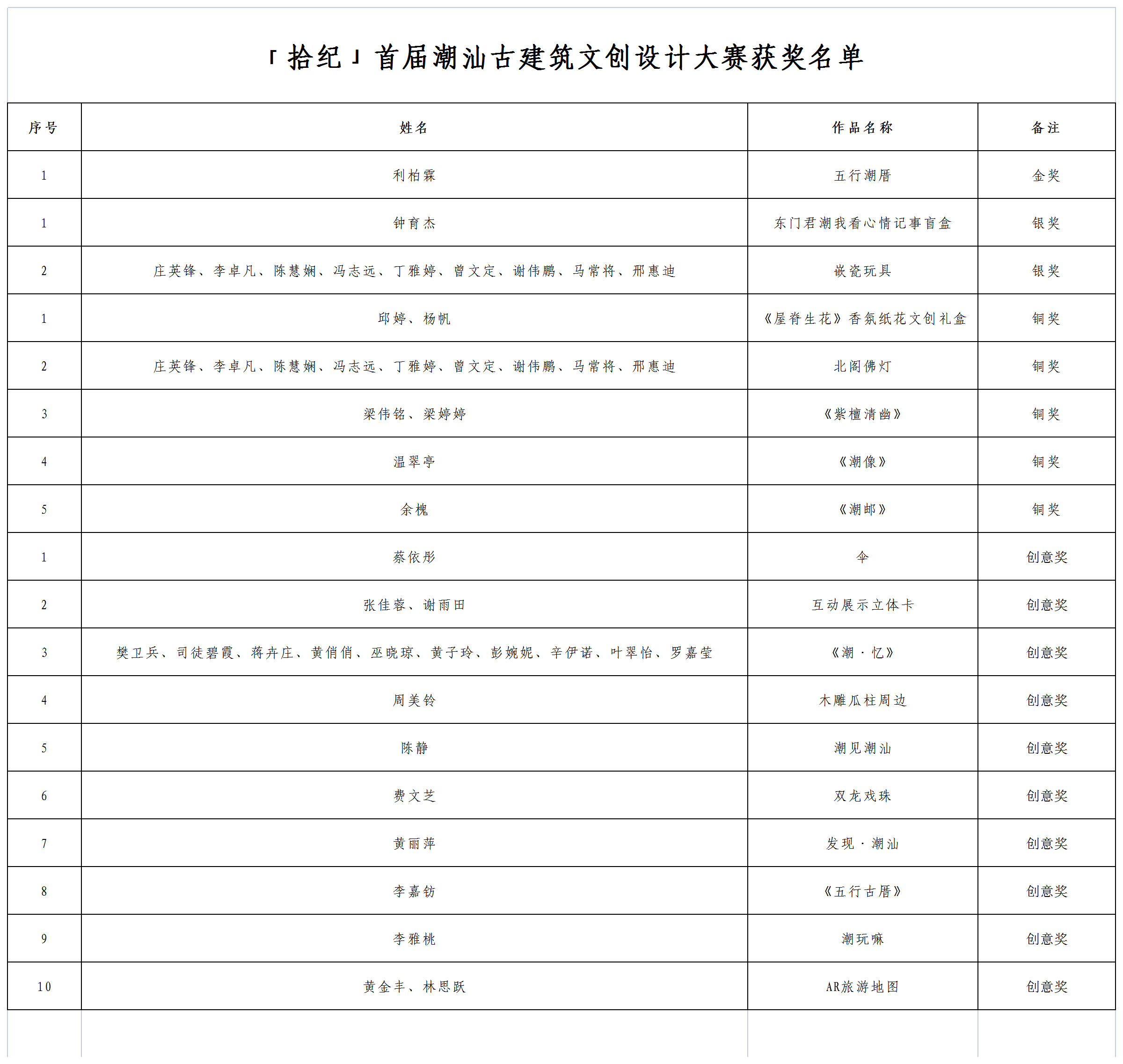祝贺各位获奖者,稍后主办方将邀请获奖者参与颁奖典礼,同期亦将举办相关学术论坛活动。 主办单位: 广东纪传英古建筑营造有限公司 (国家级非遗项目“潮汕古建筑营造技艺”保护单位) 协办单位: 广州美术学院中国南粤古驿道研究中心 支持单位: 汕头大学长江艺术与设计学院、广东建设职业技术学院、 汕头职业技术学院、汕头市文化创意产业协会、