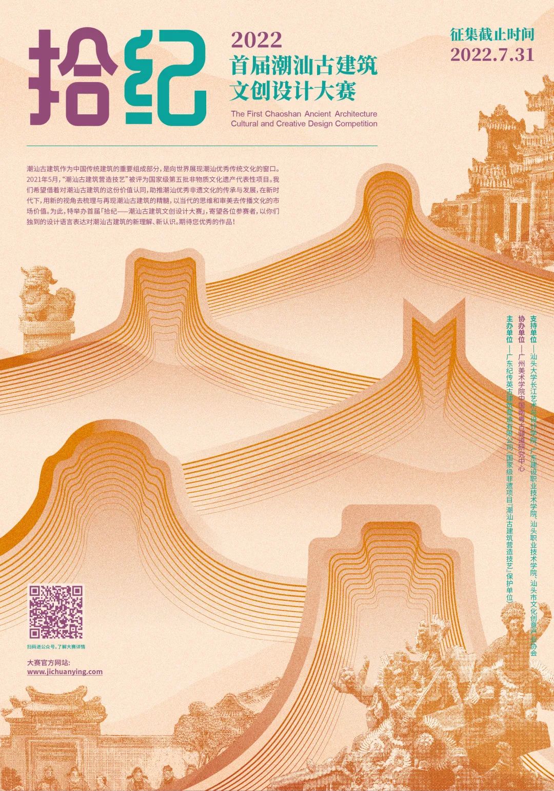 前言 潮汕古建筑作为中国传统建筑的重要组成部分,是向世界展现潮汕优秀传统文化的窗口。是潮汕先民在沿袭中原营造风格和保留古越族遗风的基础上,结合潮汕地区特有的地域、气候、人文特性而产生的一种建筑理念和实践方式。“下山虎”、“四点金”、“驷马拖车”等房屋营造风格,三载五木瓜的独特梁架结构,以及俗称“厝角头”的屋顶构筑特色“五行山墙”,都是潮汕古建筑显著的特色。涵盖了木雕、石雕、嵌瓷、灰塑和彩绘等多种装饰技艺,兼具实用功能和美学价值。 潮汕古建筑及其营造技艺 (图片源自主办方及网络) 2021年5月,“潮汕古建筑营造技艺”被评为国家级第五批非物质文化遗产代表性项目。我们希望借着对潮汕古建筑的这份价值认同,助推潮汕优秀非遗文化的传承与发展,在新时代下,用新的视角去梳理与再现潮汕古建筑的精髓,以当代的思维和审美去传播文化的市场价值。为此,特举办首届「拾纪——潮汕古建筑文创设计大赛」,寄望各位参赛者,以你们独到的设计语言表达对潮汕古建筑的新理解、新认识。 期待您优秀的作品投稿! 此次大赛依托“潮汕古建筑营造技艺”国家级非遗项目,以传承创新非遗文化为核心价值,分工艺美术类 及创意设计类 两类作品进行征集。设计者应以潮汕古建筑元素及其营造技艺为主题,用原创的、独特的、前沿的创意,对潮汕古建筑非遗进行创新诠释和延展设计。作品应具有一定的时代文化内涵、艺术品味和当代审美意趣。且在创作与设计理念、材料、造型、工艺技术及市场应用等方面有所考量。 1、非遗传承人、传统工艺匠人 2、院校设计专业教师和学生 3、艺术设计公司/企业的从业人员 4、从事文创产品开发、生产的专业机构 5、对文创产品设计有志趣的社会各界人士 本次大赛不收取任何费用 金奖1名:10000元+证书+奖杯 银奖2名:各6000元+证书+奖杯 铜奖5名:各3000元+证书+奖杯 创意奖10名:各1000元+证书+奖杯 上述奖金金额均指税前金额 A类:工艺美术类作品 指在与潮汕古建筑相关的传统原料、传统工艺和传统功能的基础上,加以创意设计而成的工艺美术作品,须为已完成装裱、配座等后续配套工序。包括但不限于传统技艺、传统美术等各类工艺品。单一或系列作品皆可,此类别只需提交电子作品,若进入复评阶段,则须提交实物原作至大赛主办方。 B类:创意设计类作品 指运用潮汕古建筑营造技艺主题元素,衍生设计而成的文创产品,包括但不限于生活用品、装饰品和旅游纪念品等衍生品。单一或系列套组皆可,不限材质,作品须考虑量产的可行性。此类别只需提交电子作品,若进入复评阶段,则须提交实物打样或深化设计图至大赛主办方。 参赛者将下列资料以邮件方式 发送到大赛指定邮箱 1224890971@qq.com 邮件命名方式如:作者姓名-古建筑文创大赛-所在城市名 1、电子作品:每件作品需提交不超过6张图片,图片需能体现作品全貌与局部细节。图片为JPG格式,300dpi,RGB色彩,A3尺寸,单张图片不超过20M。需附带word格式作品设计说明(见第2点)。图片上不要出现作者信息。 2、说明文档:包含参赛者姓名、手机、微信号、邮箱、联系地址、所参赛类别(A或B)、工作单位(或就读院校)、指导老师(如有),以及作品的设计说明(包括创意概念、材料、工艺说明及市场预估等,不超200字)。 3、 如有视频文件辅助解读作品,视频时间不超3分钟,画幅宽高比16︰9,分辨率最低要求为 1280*720,大小不超过60MB,格式为MP4。 以上1和2为必需提交,3为可选择提交。 2022年7月31日下午5点 创意概念 符合主题 表现技巧 量产评估 广东省传统建筑名匠 高校相关专业教授 文创设计与产业专家等 (具体以主办方公布时间为准) 1、获奖作品的版权将转让至主办方,届时作者需签署《著作权转让协议》。作者保留对其作品的永久署名权。 2、未获奖作品的版权仍归原作者所有。主办单位拥有对所有参赛作品进行展示、报道、宣传及用于活动的权利,无须支付作者版权使用费。 3、每位参赛者均应对自己的设计作品负责,若参赛作品涉及侵犯第三方合法权益的,均由设计者承担全部责任。获奖作品涉及侵权的,无论其是否将版权转让至主办方,均由其自身承担全部责任,包括但不限于给第三方和主办方造成的一切损失。 4、主办方享有对获奖作品方案进行再设计、生产、销售、展示、出版等全部权益。 5、凡报名参与活动者均视为认同并遵守本声明事项。 6、主办方对本活动保留最终解释权。 投稿邮箱:1224890971@qq.com 联系电话:0754-88135093 地址:广东省汕头市泰山路138号(纪传英古建筑大楼) 网站:www.jichuanying.com