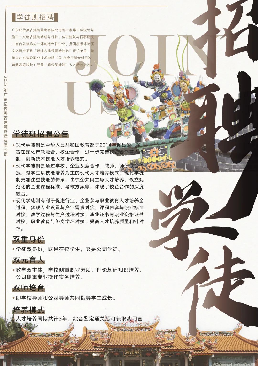 广东纪传英古建筑营造有限公司是一家集工程设计与施工、文物古建筑修缮与保护、仿古建筑与园林建筑、室内外装饰为一体的综合型企业,是国家级非物质文化遗产项目“潮汕古建筑营造技艺”保护单位。常年与广东建设职业技术学院(公办全日制专科层次普通高等院校)开展“现代学徒制”人才培养计划。现代学徒班开始接受报名,想了解更多请咨询: