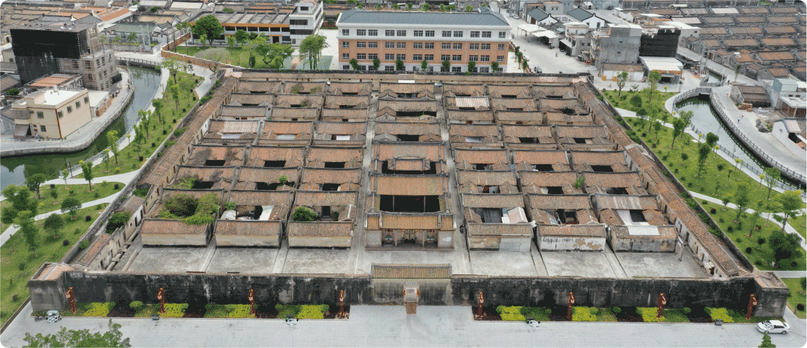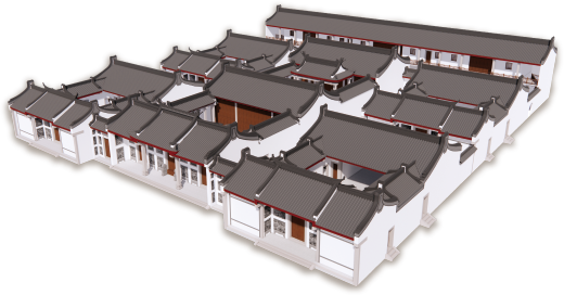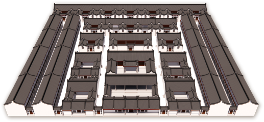 潮汕传统民居——百鸟朝凰“百鸟朝凰”是以“驷马拖车”为主体,外包“四点金”或“下山虎”,房间可以达到100间的规模。其主体建筑由两座以上“四点金”纵向合并与扩充,主体建筑两侧各有一列或两列排房,俗称“从厝”,以“火巷”隔开,“从厝”排屋一般是“一厅四房五间过”,或由两组一厅二房连成。两边围护的从厝和后包多由一座座“下山虎”相连围护而成,要有总数100间围绕中心厅堂的"凰"才够规格,才能称之为真正的"百鸟朝凰"。