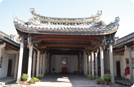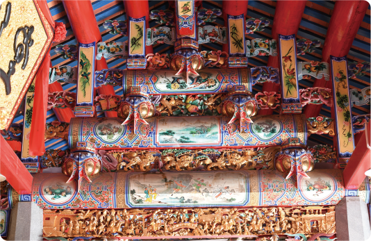 屋架(三载五木瓜)“三载五木瓜”屋架安装方式也潮汕传统建筑营造与众不同之处。是由三条载作为替力梁和五粒木瓜连接上下载的结构形式,采用斗、筒、弯板、凤过、楚尾等雕花构件连接,屋架采用童柱(短柱)支撑屋面楹。因为自乾隆时期以后,这些童柱(短柱)都做成夸张的三棱南瓜造型,所以称为木瓜。而这个由三根横梁(潮汕称“载”)和五段木瓜组成的梁架结构就叫“三载五木瓜”。