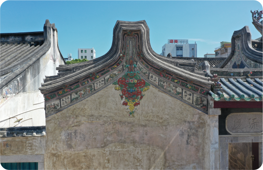 硬山屋顶与五行山墙潮汕传统建筑屋顶, 一般采用硬山顶。硬山顶屋面为“人”字形两坡屋顶一种形式,屋顶两坡交界处常以片瓦或砖铺砌成屋脊,两侧山墙与屋面齐平或略高于屋面,为使山墙形象更为突出,再沿山墙设置垂脊。潮汕民居采用的“硬山顶”屋顶比“悬山顶”屋顶抗风,防火的性能好。潮汕厝头(称屋角)历来都讲究所属五行,有金、木、水、火、土。